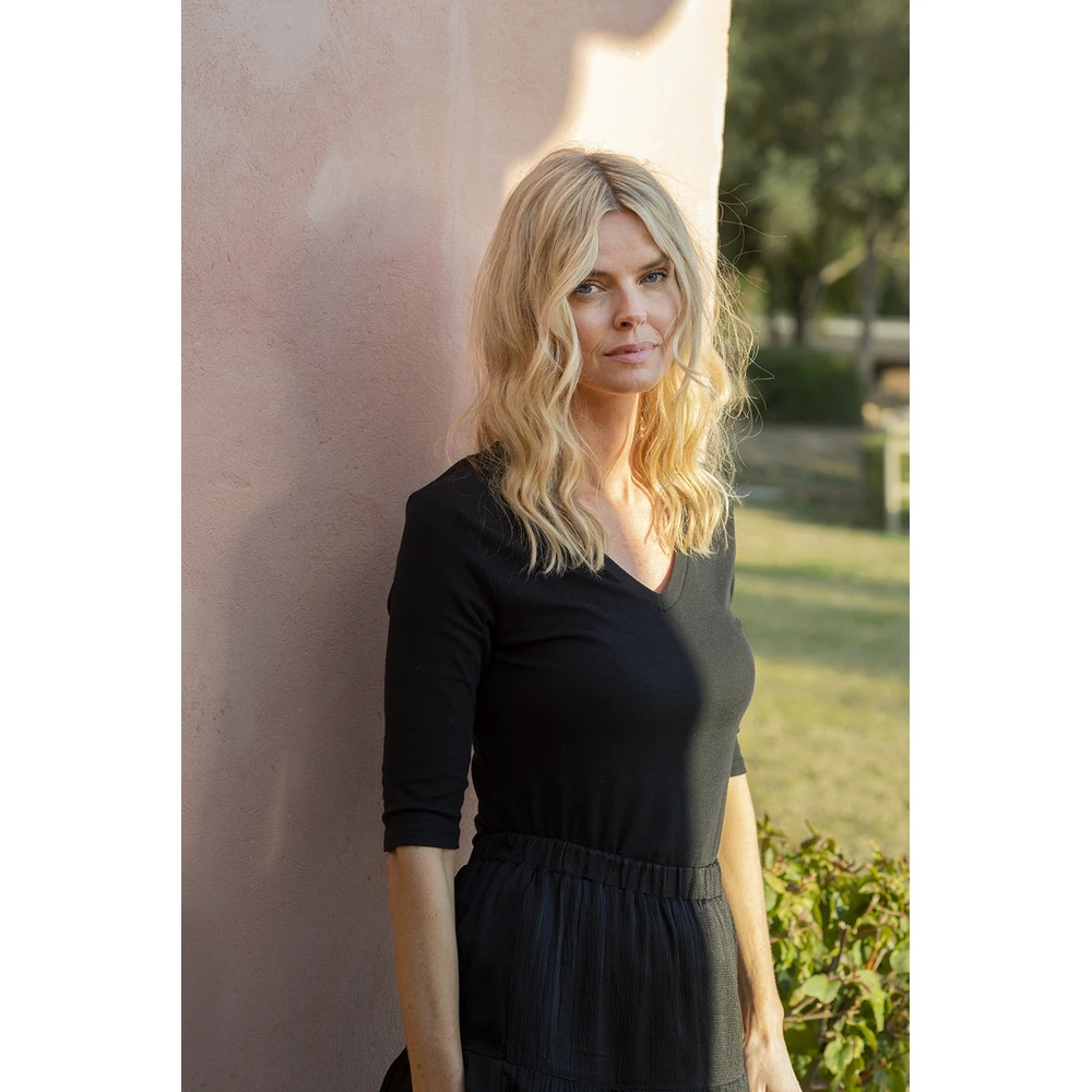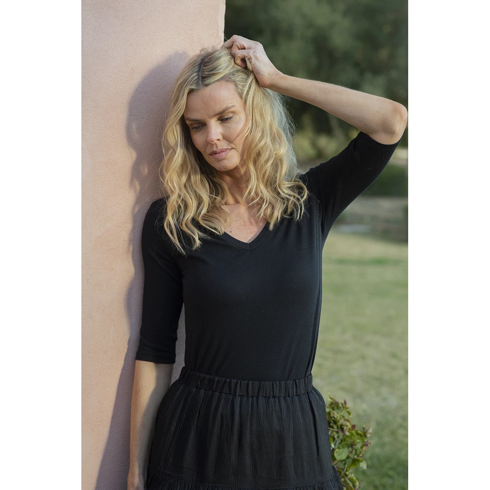 - Arnie Says Eileen Rib T-Shirt i sort er en must-have for enhver damegarderobe. Denne T-skjorten kombinerer stil og komfort for en moderne look.