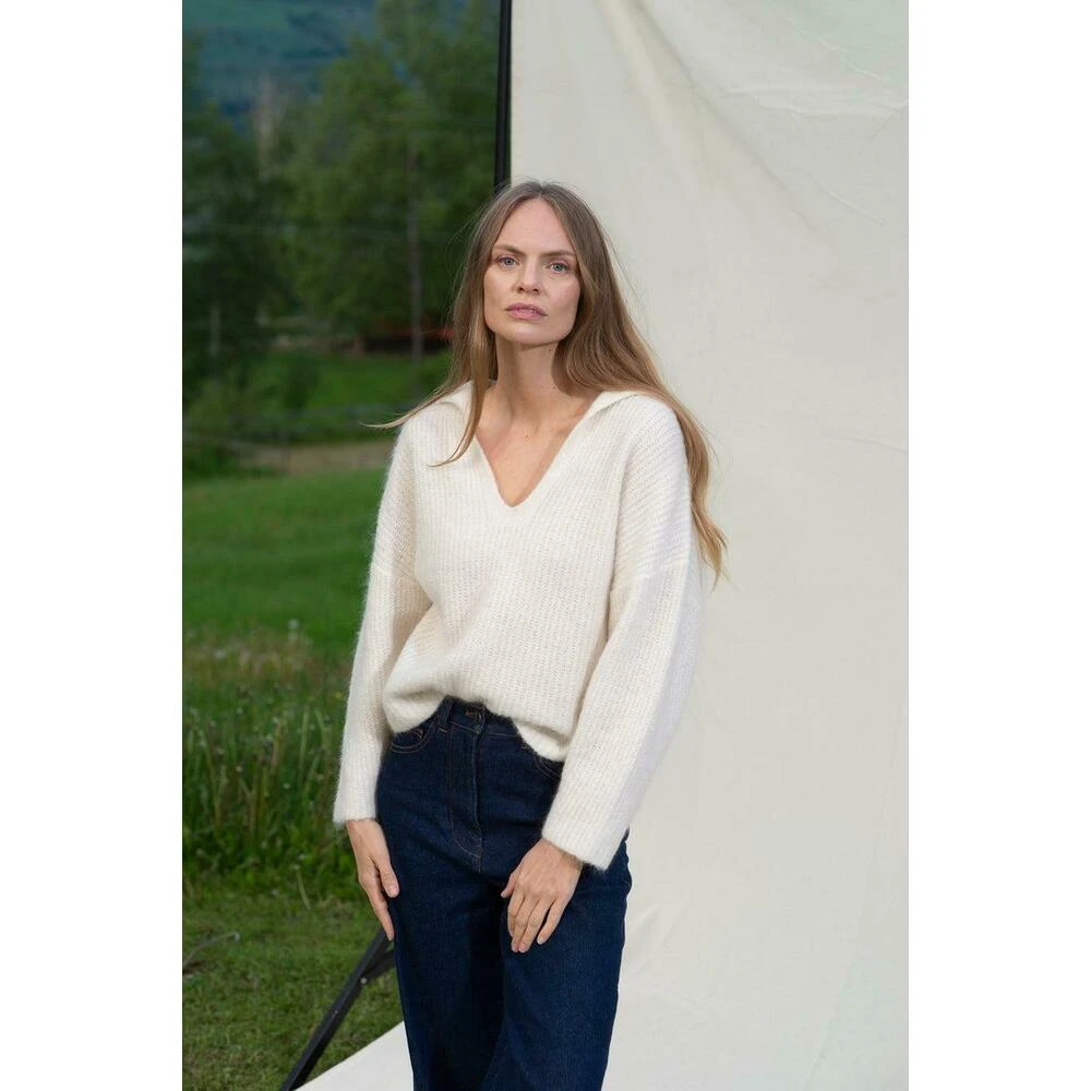 - Arnie Says V-hals strikkejakke i hvit er en must-have for enhver damegarderobe. Denne genseren kombinerer stil og komfort for et sofistikert utseende.