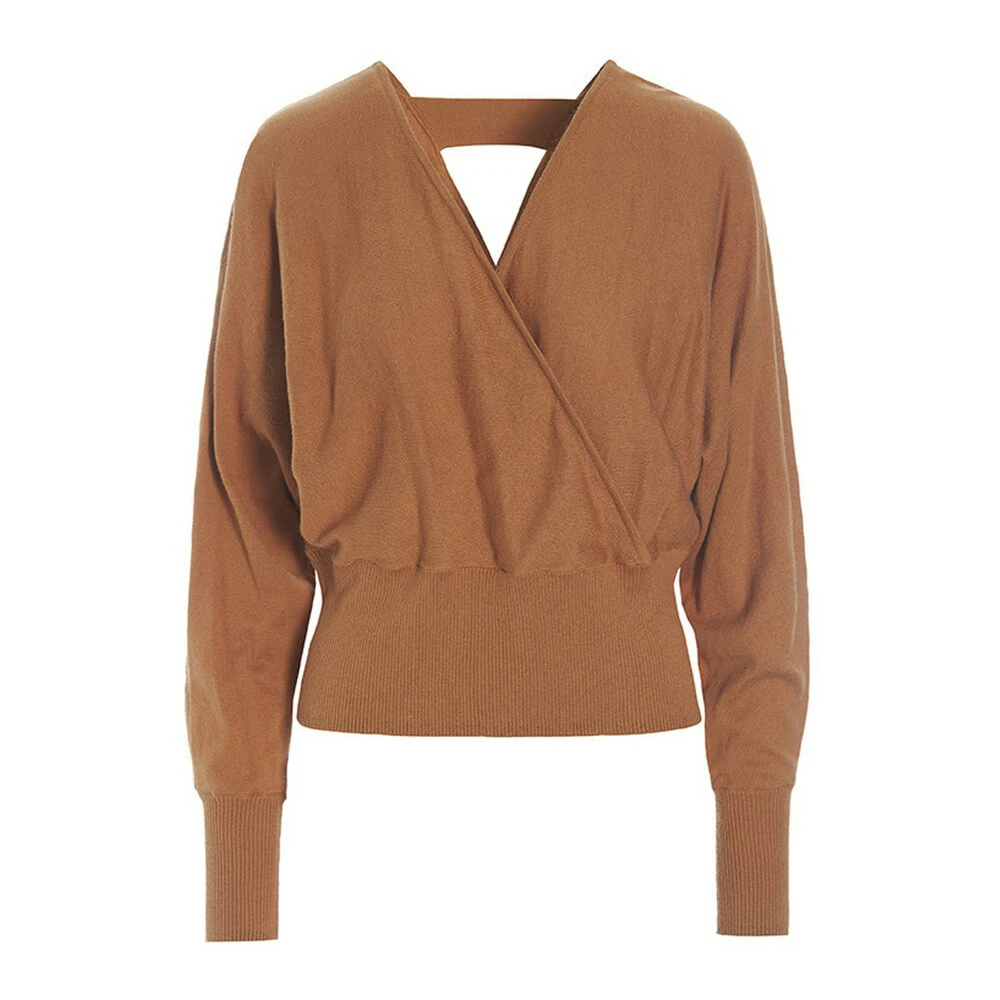 - V-halsen gir en feminin og elegant touch, mens den brunlige fargen gir et varmt og innbydende utseende. Enkel å matche med andre plagg for en komplett look.