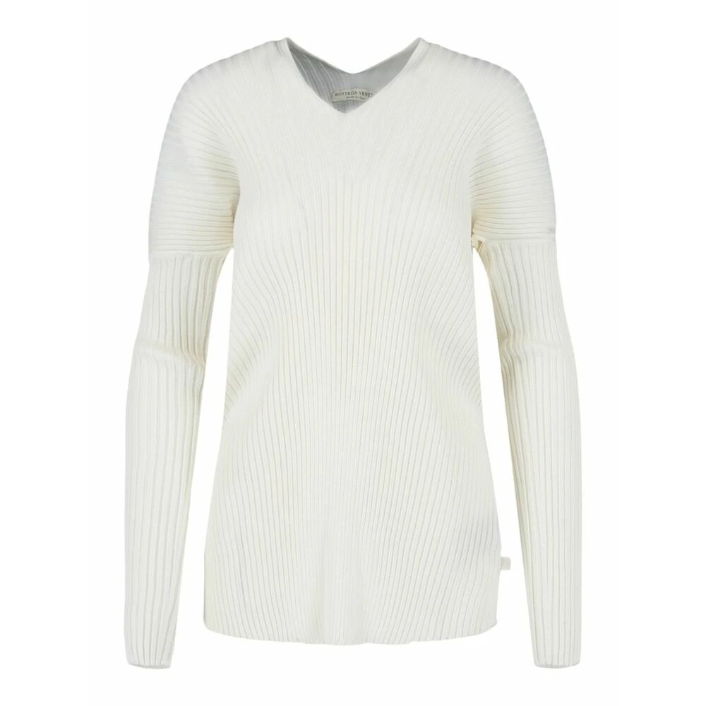 - Bottega Venetas hvit V-hals strikkegenser er en elegant og tidløs dameoverdel som kombinerer komfort med stil. Perfekt for både formelle og uformelle anledninger.