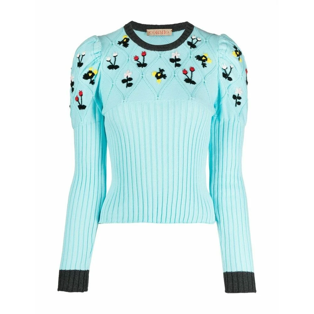 - Cormios rundhalsede strikket genser i blå er en must-have for enhver dame som verdsatter både stil og komfort. Denne genseren er laget av høykvalitetsmaterialer som gir en myk og behagelig følelse mot huden.