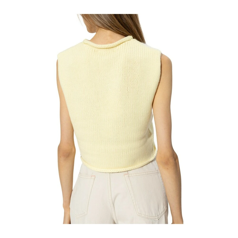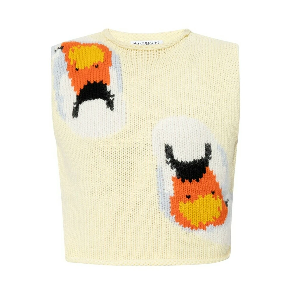 - JW Anderson Graphic Vest i gul farge er en stilfull og moderne strikkejakke for damer. Denne vesten er designet for å gi deg en sofistikert look samtidig som den holder deg varm og komfortabel.