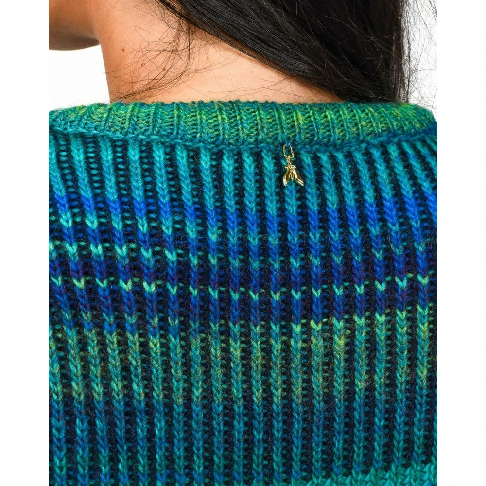 - Den Patrizia Pepe rundhalset strikkejakken i blå er en must-have for enhver damegarderobe. Den kombinerer komfort og stil på en unik måte.