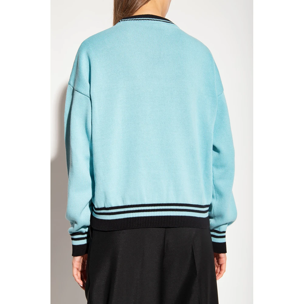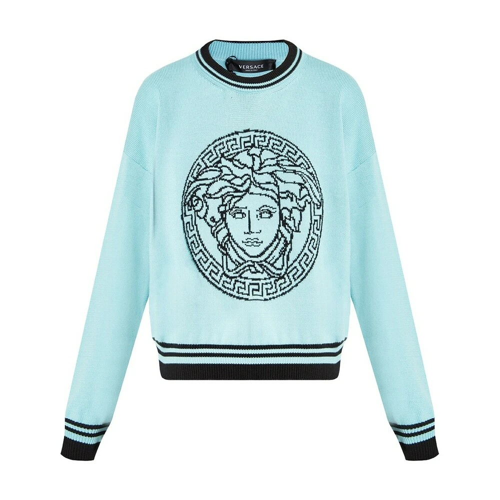 - Denne Versace genseren i blå farge er et must-have for enhver motebevisst kvinne. Den ikoniske Medusa-hode-logoen gir et sofistikert touch.